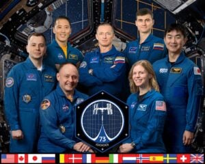 Expedition 73 crew from three different space agencies. Seated in the front row are NASA astronauts Mike Fincke and Zena Cardman. In the back row from left are, Roscosmos cosmonaut Oleg Platonov; NASA astronaut Jonny Kim; Roscosmos cosmonauts Sergey Ryzhikov and Alexey Zubritsky; and JAXA (Japan Aerospace Exploration Agency) astronaut Kimiya Yui. (Credit: NASA/Josh Valcarcel)